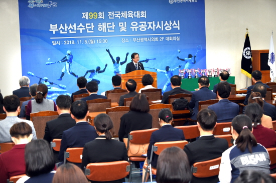 [부산=일요신문] 박영천 기자 = 김석준 부산광역시교육감이 5일 오후 3시 부산시의회 대회의실에서 오거돈 부산시장, 박인영 부산시의회의장을 비롯해 부산시체육회 소속 임원과 선수, 지도자 등 200여명이 참석한 가운데 열린 ‘제99회 전국체육대회 부산선수단 해단식’에 참석해 축사를 가졌다.<사진>