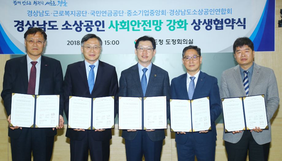 협약 대상 기관은 근로복지공단(이사장 심경우), 국민연금공단(이사장 김성주),중소기업중앙회(회장 박성택), 경상남도소상공인연합회(회장 임진태) 등이며, 향후 민선7기 도지사 공약사업인 1인 자영업자 고용보험료 지원, 경남일자리안정자금, 노란우산공제 희망장려금 지원 사업 등 추진에 힘을 모으기로 했다.