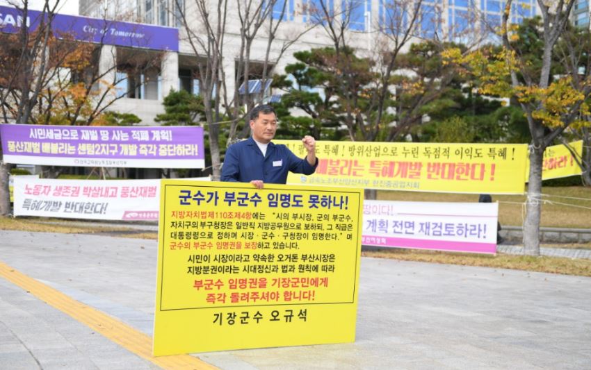 이날에도 오군수의 부군수 임명권 반환을 촉구하는 무기한 1인 시위에 뜻을 같이 하는 주민 70여명이 부산시청 시민광장을 찾았다.