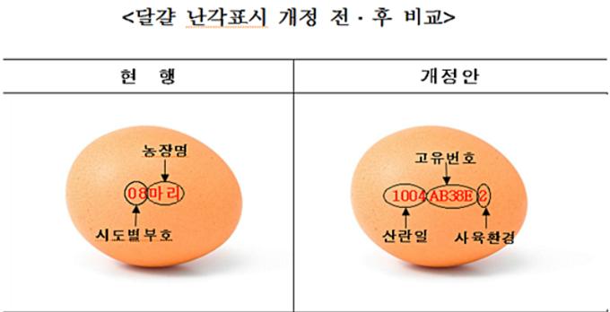 지난해 8월 살충제 달걀사태를 계기로 축산물 표시기준이 개정됨에 따라 올해 8월 23일부터 달걀 껍데기에 생산자 고유번호 5자리와 닭 사육환경번호 1자리가 표시돼 생산되고 있음을 알리기 위해서였다.