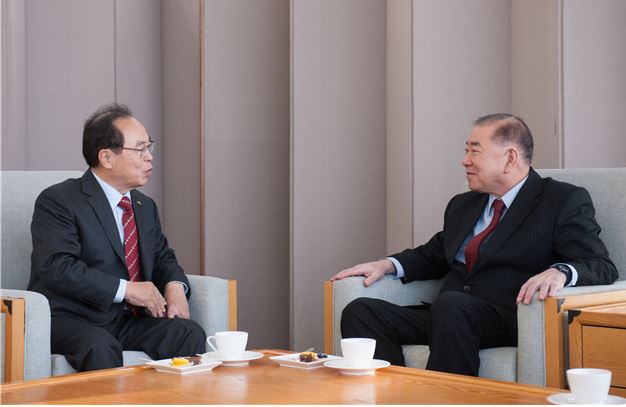 오거돈 부산시장이 문정인 대통령 특보를 접견하고 있다.