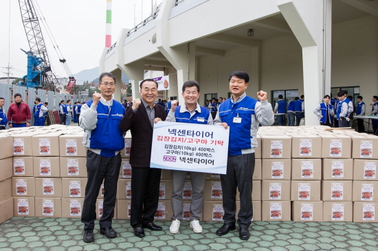 넥센타이어 임직원 110여명은 이날 양산 공설 운동장에 모여 2천여 포기의 김장 김치를 담갔다. 김치는 지역의 소외계층 400여 가구에게 고구마와 함께 전달됐다.