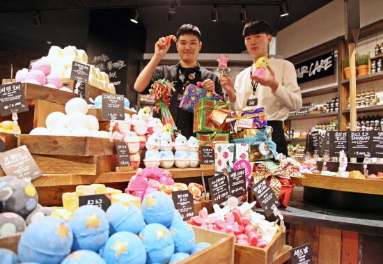 신세계센텀시티몰 3층 러쉬 매장에서는 크리스마스 한정 입욕제를 선보인다. 산타클로스, 지팡이, 스노우맨 등 종류도 다양하다.
