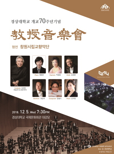 이번 교수음악회는 경상대학교 사범대학 음악교육과 모든 교수가 참여하는 가운데 창원시립교향악단의 협연과 상임지휘자 김대진 예술감독의 연출로 진행된다.