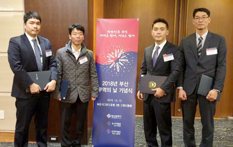 제55회 무역의 날을 맞아 표창을 수상한 (왼쪽부터) 비아이피㈜ 김태엽 과장, 비아이피㈜ 홍경환 조장, 비엔스틸라㈜ 김대홍 차장, 비엔스틸라㈜ 박종진 직장