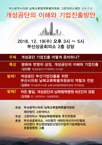 [부산=일요신문] 하용성 기자 = 의료봉사단체 그린닥터스 재단(이사장 정근)은 부산시의회(의장 박인영) 남북교류협력특별위원회(위원장 신상해)와 함께 오는 19일 오후 3시 부산상공회의소 2층강당에서 ‘개성공단 기업진출 설명회’를 마련한다.
