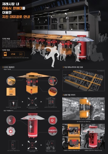 재래시장 내 이동식 판매대 이용한 지진 대피경로 안내 예시물