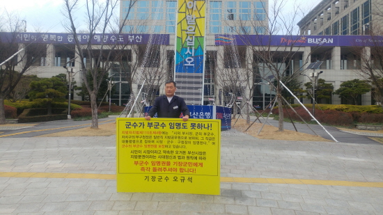 오 군수는 이날 “기장군민과 함께 법과 원칙에 따라 계란으로 바위를 치는 절박한 심정으로 부산시로부터 부군수 임명권을 돌려받을 때까지 무기한 1인 시위를 이어나가겠다”고 강조했다.