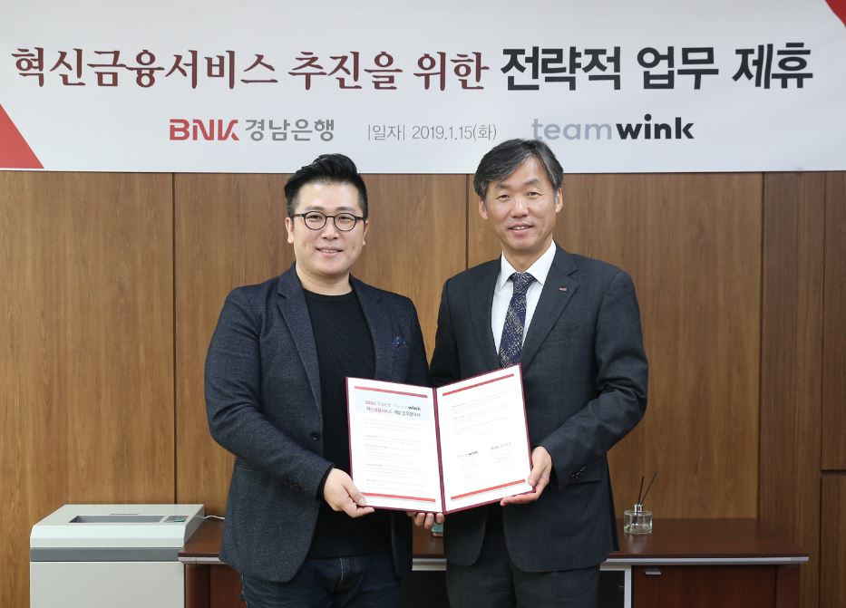 BNK경남은행 최우형 D-IT그룹장(사진 오른쪽)이 팀윙크 주식회사 김형석 대표이사와 혁신금융서비스 추진을 위한 전략적 업무 협약을 체결하고 있다.