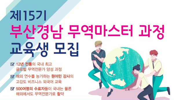 ‘부산경남 무역마스터과정’은 부산시와 (재)부산인재평생교육진흥원, 한국무역협회 부산지역본부의 공동주관으로 운영되며, 참가자격은 부산경남지역 미취업청년(만39세 이하) 대학졸업(예정)자로 전공 제한은 없다. 교육과정 수료자는 5개월간 취업을 위한 집중 지원을 받는다.