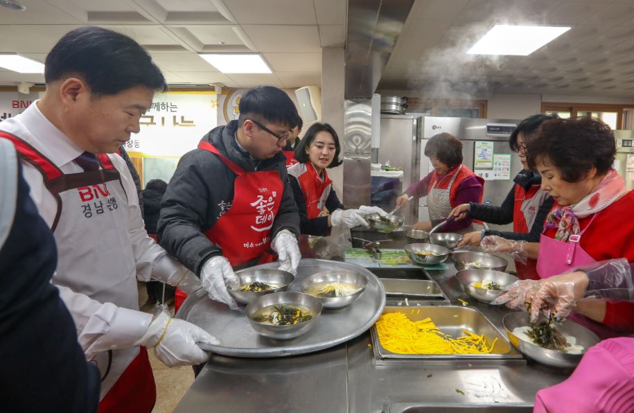 지난 22일 무학과 BNK경남은행은 지난 해 11월에 맺은 사회공헌협약 일환으로 창원시 의창구 의창구종합복지관에서 소담무료급식소와 함께 ‘신년 떡국 나눔행사’를 진행했다.