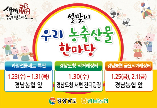 [경남=일요신문] 정동욱 기자 = 경남농협(본부장 하명곤)은 설을 맞아 우리 농축산물 소비촉진과 직거래를 통한 소비자 물가 안정을 위해 다양한 직거래장터 특판행사를 개최한다.