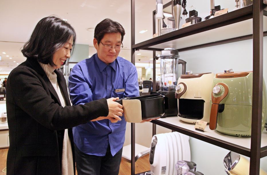 고객이 ‘톰슨’ 에어프라이어를 보고 있다.