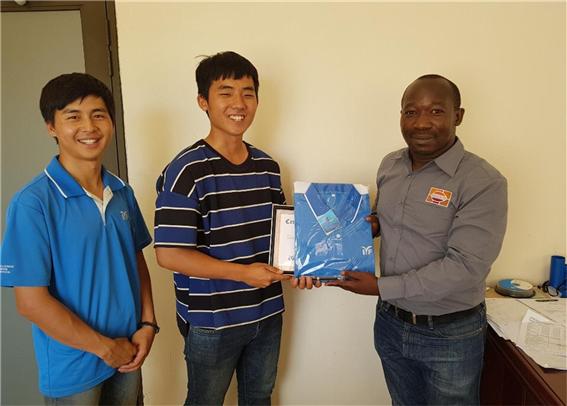 에스와티니 건축학교 기초공사설계문을 후원한 이에게 감사문 및 국제청소년연합IYF티셔츠를 건네주는 원종기 단원(중간)