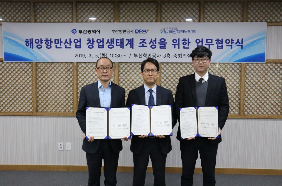 [부산=일요신문] 박영천 기자 =부산항만공사(이하 BPA, 사장 남기찬)는 지난 5일 본사에서 부산시, (재)부산테크노파크와 지역 해양항만산업 창업생태계 조성과 창업활동 지원을 위한 업무협약을 체결했다고 7일 밝혔다.