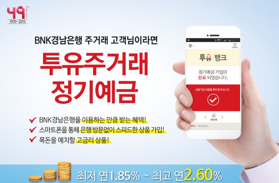 디지털금융본부 최우형 부행장은 “BNK경남은행을 이용하는 주거래 고객들에게 더 많은 혜택을 제공하고자 투유주거래정기예금을 출시했다. 복잡한 인증 절차 없이 간편하게 가입할 수 있는 만큼 재테크 수단으로 활용하길 바란다”고 말했다.