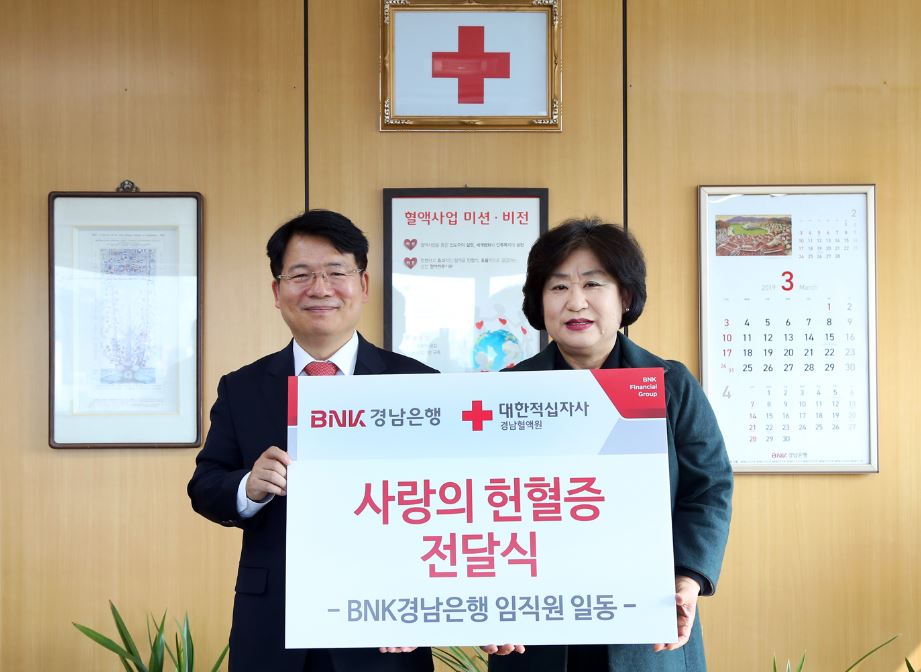 안태홍 상무는 “임직원들의 나눔으로 모은 헌혈증이 꼭 필요한 지역민에게 전달돼 의미 있게 사용 되기를 바란다. BNK경남은행은 앞으로도 사랑의 헌혈 운동을 꾸준히 전개해 헌혈 수급은 물론 생명나눔 문화를 확산시켜 나가겠다”고 말했다.