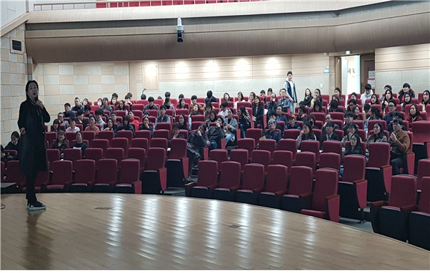 8일 경상대학교 국제어학원에서 서울대학교병원 의생명연구원 강지영 박사가 LMO 생물안전교육을 실시하고 있다.