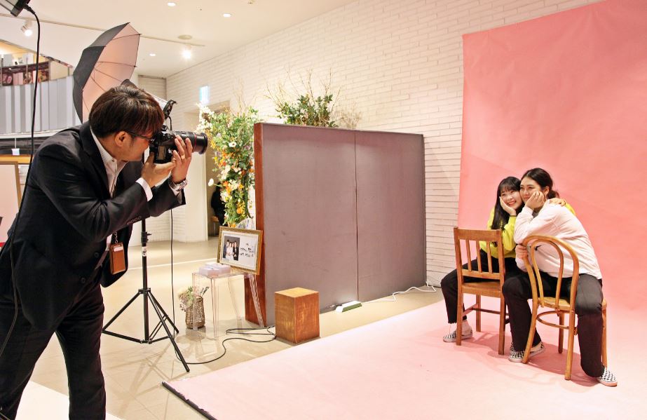광안리 사진관이 팝업스토어가 백화점 지하 2층에 오픈해 고객들이 기념사진을 촬영하고 있다.