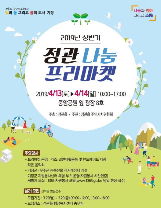 ‘나눔과 참여 그리고, 소통’이라는 주제로 개최되는 ‘정관 나눔 프리마켓’은 오전 10시부터 오후 5시까지 개최되며, 누구나 참여가 가능하다.