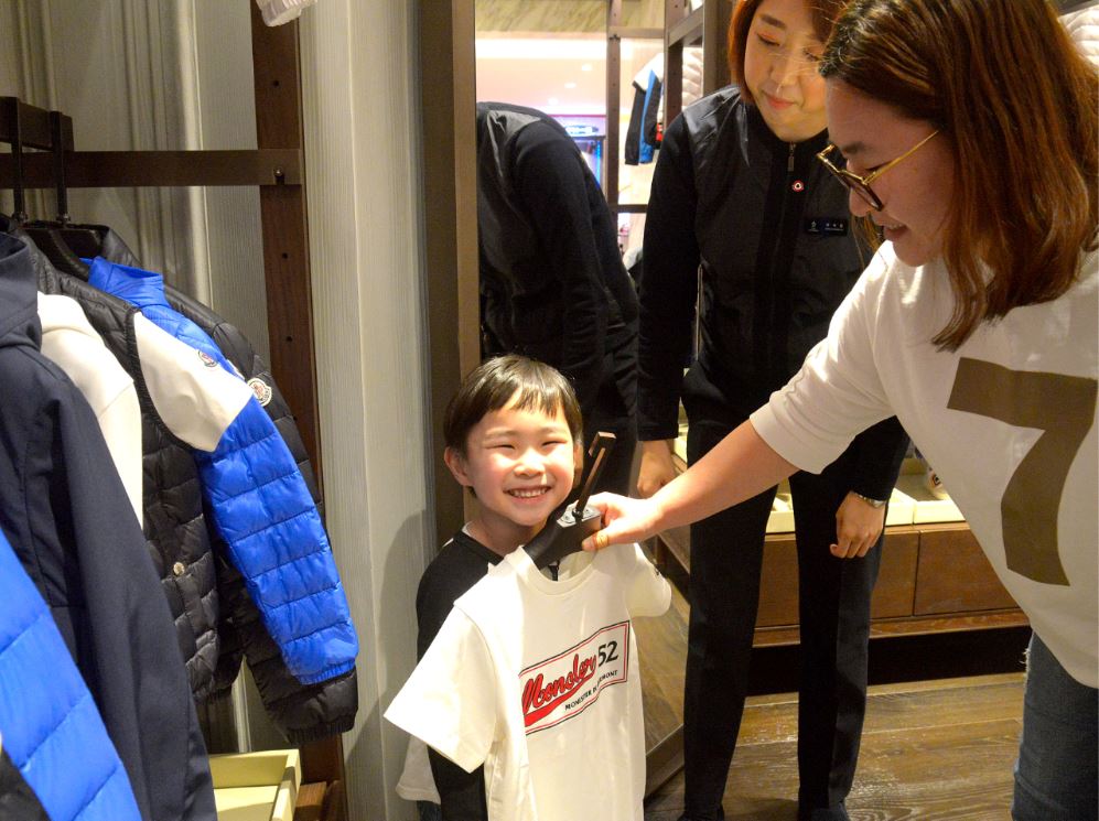 롯데백화점 부산본점 6층에 위치한 몽클레르 앙팡 매장에서 엄마와 아들 고객이 즐거운 표정으로 상품을 살펴보고 있다.