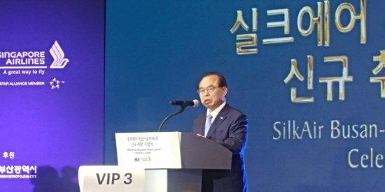 오거돈 부산광역시 시장이 지난 17일 실크에어 부산 싱가포르 신규취항 기념식에서 축사를 갖는 모습.