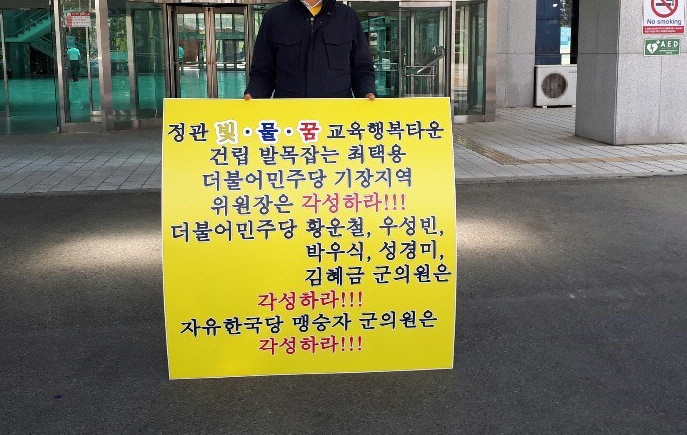 22일 오전에는 기장군민 A 씨가 ‘정관 빛·물·꿈 교육행복타운 조성’ 건립 발목 잡는 더불어민주당 최택용 기장지역위원장은 각성하라’, ‘민주당 황운철·우성빈·박우식·성경미·김혜금 의원, 한국당 맹성자 의원은 각성하라’는 등의 내용이 적힌 피켓을 들고 기장군청 앞에서 1인 시위를 펼쳤다.
