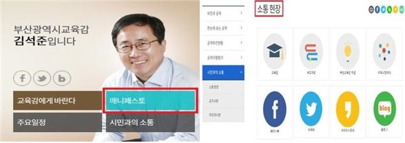 부산광역시교육청 홈페이지-매니페스토(왼쪽)와 웹소통 강화 위한 시민과의 소통현장.