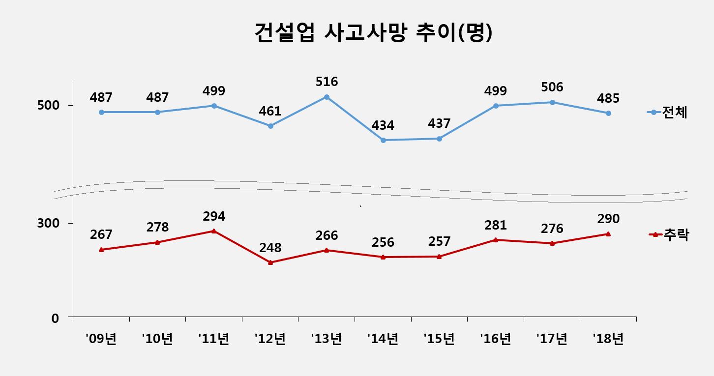 건설분야에서 발생한 재해 중 추락으로 인한 사고가 가장 큰 비중(60%, 290명)을 차지하며, 지난 10년간의 추이도 답보상태에 머문 것으로 나타났다.
