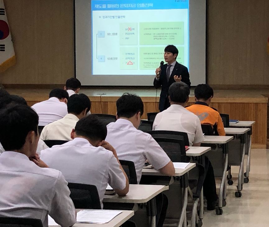 금번 은퇴설계 교육을 진행한 NH농협은행 WM연금부 남상웅차장은 직장인의 최대관심사인 연말정산 세테크 상품들을 소개하고, 노후를 대비한 다양한 연금인출전략을 구체적인 사례별로 제시함으로써 교육에 참여한 소방관들에게 큰 호응을 얻었다.