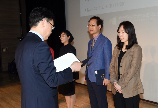 전영근 부산광역시교육청 교육국장이 18일 오후 1시 30분 부산학생예술문화회관에서 열린 교원힐링 한마당에서 ‘제38회 스승의 날 기념’ 유공 교원에게 표창장을 전수하고 있다.