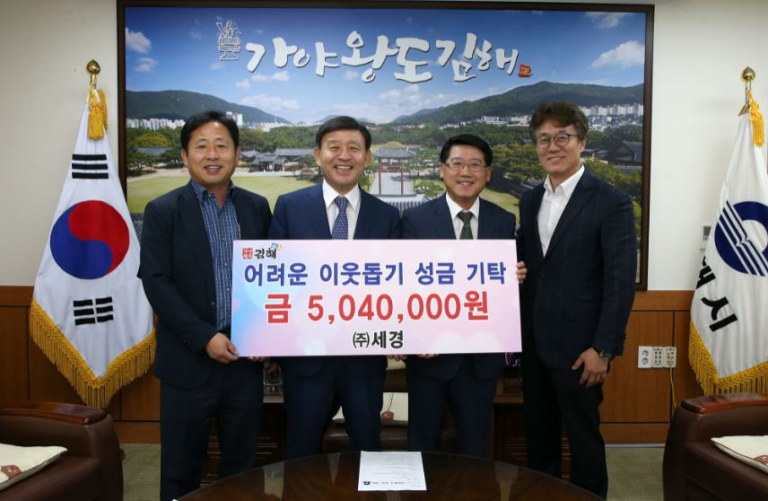 [경남=일요신문] 박영천 기자 = 김해시는 29일 ㈜세경에서 어려운 이웃을 위해 사용해 달라며 성금 504만원을 기탁했다고 밝혔다. 이 성금은 생활이 어려운 저소득 가정에 전달된다.