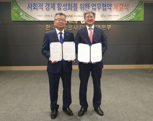 한국공항공사 정덕교 본부장이 13일 (사)사회적기업연구원과 사회적 경제 기업의 홍보 및 판로지원을 위한 업무협약을 체결했다.