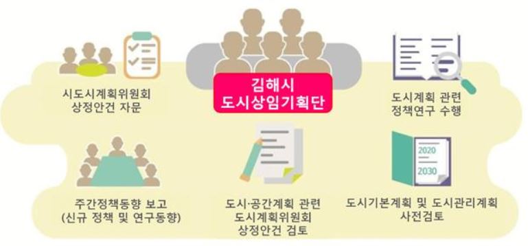 관련법상 인근 창원시 등 인구 100만 이상 대도시는 도시발전연구원 운영이 가능하지만 그렇지 못한 김해시는 이를 대신해 작은 도시발전연구원 개념의 도시상임기획단에 지역의 장기 미래 비전을 제시하는 싱크탱크 역할을 맡겼다.