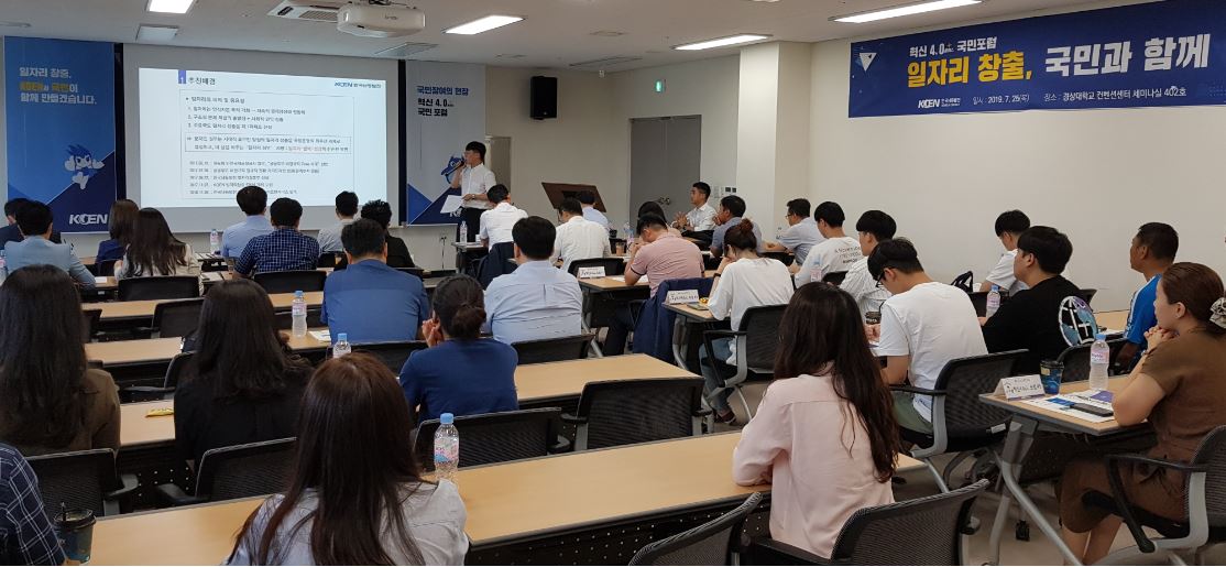 25일 경상대학교 컨벤션센터에서 열린 혁신 4.0 플러스 국민포럼에서 한국남동발전의 일자리 창출 현황과 향후 계획이 소개되고 있다.