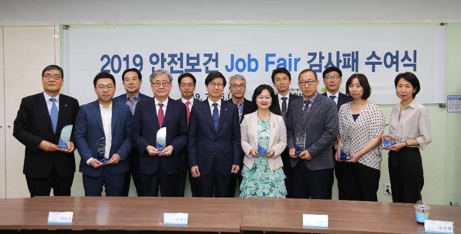 안전보건공단 박두용 이사장(앞줄 왼쪽 4번째)은 2019 안전보건 잡페어에 참여한 14개 기관 및 기업에 감사패를 수여하고 기념촬영을 가졌다