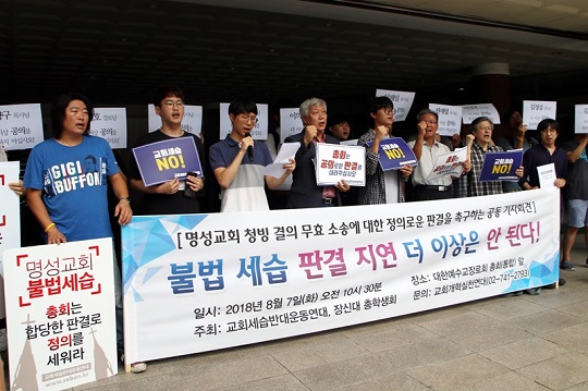 2018년 8월 7일 명성교회 김하나 목사 청빙 결의 무효를 촉구하는 세반연과 장신대 총학생회가 기자회견을 하고 있다. 출처=교회세습반대운동연대 홈페이지