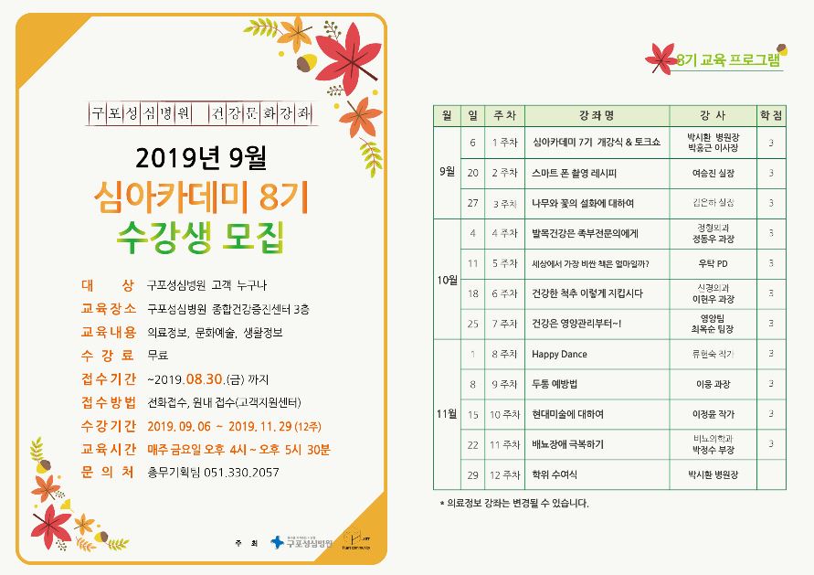 심아카데미 8기는 내달 6일부터 11월 29일까지 매주 금요일 오후 4시부터 5시까지 총 12주의 과정으로 개설될 예정이며 의료정보, 생활정보, 문화예술 등 다양한 강의가 마련돼 있다.