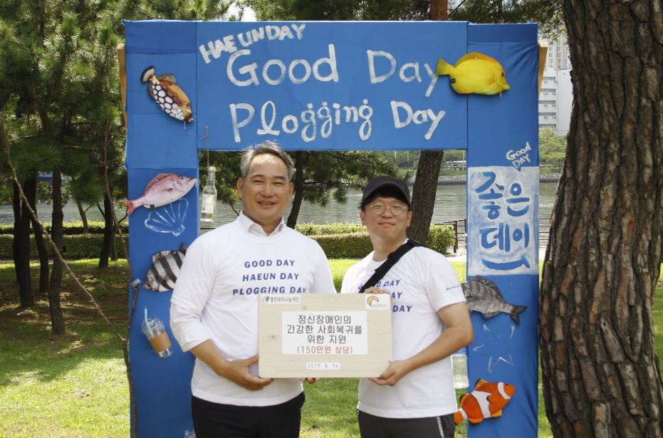 플로깅은 영어 pick up(줍다)와 jogging(조깅)의 합성어로 생활 속 조깅을 하며 주변 쓰레기를 줍는 운동을 뜻한다. 이 날 활동을 통해 봉사단은 해운대 수영강 일대 10km를 걸으며 환경쓰레기 10포대를 수거했다.