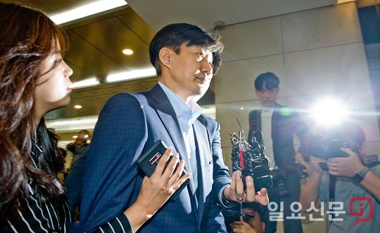 조국 법무부 장관 후보자가 8월 29일 서울 종로구 적선현대빌딩의 인사청문회 준비 사무실로 출근하고 있다.