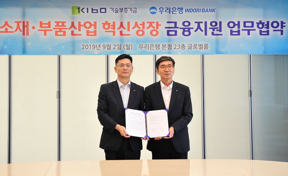 기술보증기금(이사장 정윤모, 이하 기보)은 우리은행(은행장 손태승)과 2일 서울시 중구 소재 우리은행 본점에서 ‘소재·부품산업 혁신성장 금융지원 업무협약’을 체결하고 소재·부품산업의 육성과 지원에 적극 협력키로 했다.