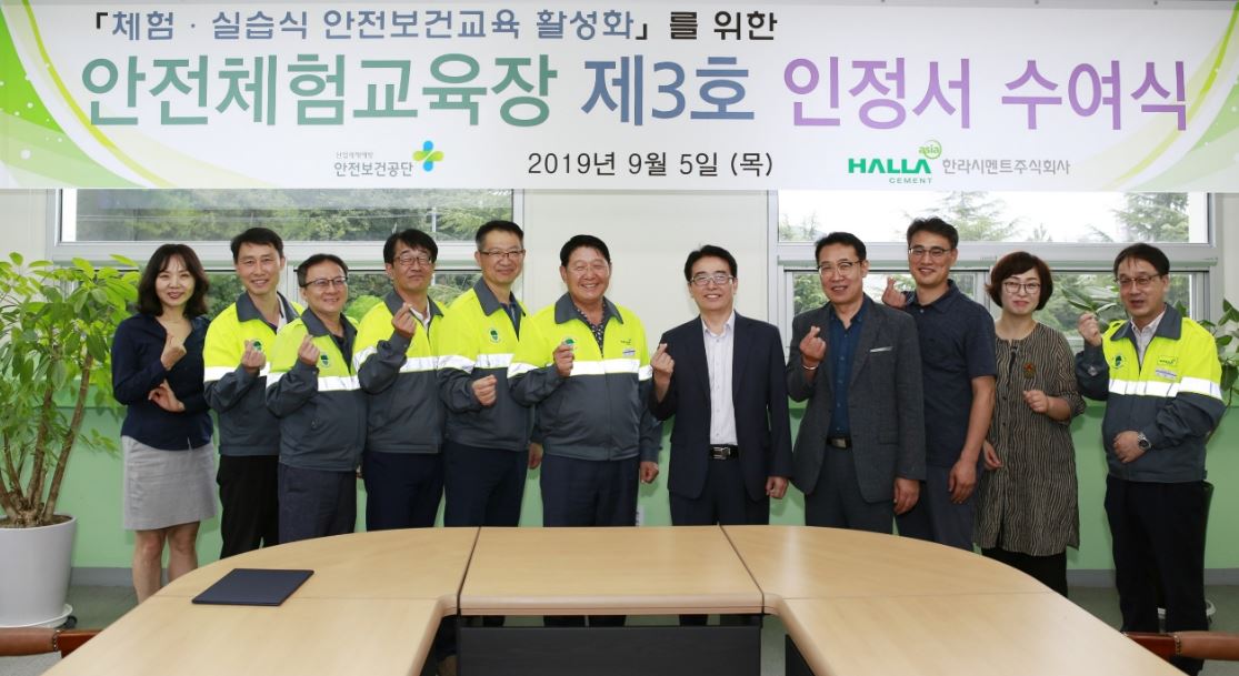 안전보건공단은 한라시멘트의 안전보건교육센터에 안전체험교육장 제3호 인정서를 수여했다. (오른쪽 다섯 번째 안전보건공단 이처문 교육문화이사, 오른쪽 여섯 번째 한라시멘트 임경태 대표이사)