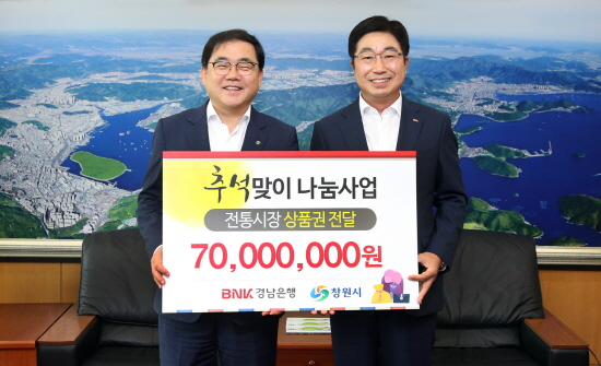 BNK경남은행 황윤철 은행장(오른쪽)이 지난 3일 창원시청을 방문해 허성무 시장에게 ‘전통시장온누리상품권 기탁증서’를 전달하고 있다.
