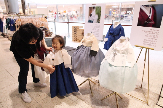 신세계 센텀시티 6층 ‘지오한복’에서 아동 고객이 한복을 고르고 있다. ‘지오한복’은 오는 11일까지 만날 수 있다.