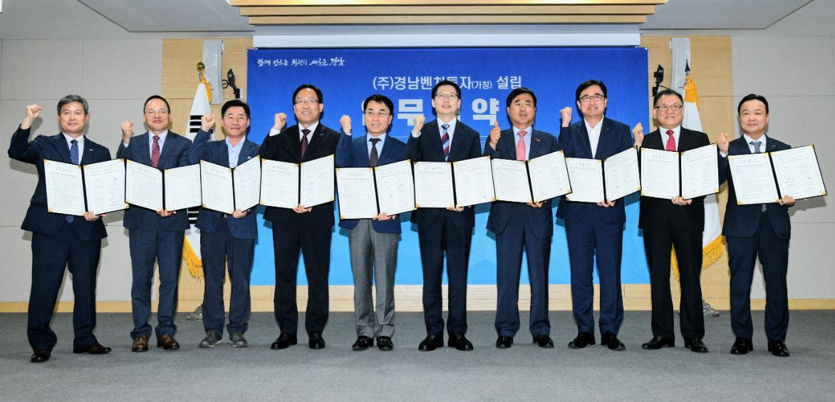 경상남도는 지난 9일 오후 도정회의실에서 가칭 ‘(주)경남벤처투자’ 설립을 위한 업무협약을 체결했다. 이날 협약식에는 김경수 도지사, 한철수 창원상공회의소 회장 등 출자자 10명과 관계자 등 40여 명이 참석했다.