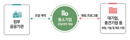 중소기업이 공공기관과 직접 조달계약을 체결하고, 멘토기업(대기업)은 중소기업으로부터 계약의 일부를 하청 받는 방식이다.