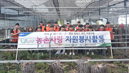 [경남=일요신문] 정동욱 기자 = 경남농협(본부장 하명곤)은 부산대학교 봉사동아리 ‘반딧불’ 소속 학생 30여 명과 함께 21일 창원시 북면 무동마을에서 농촌사랑 자원봉사활동을 전개했다.<사진>