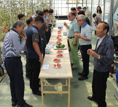 사천시가 시험재배하고 있는 미니수박을 수확해 시식해 보고 있다.
