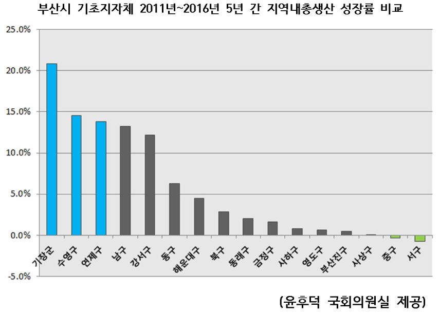 더불어민주당 윤후덕 의원이 통계청으로부터 제출받은 지역총생산 자료(2011~2016년) 에 따르면, 기장군은 지역내총생산이 연평균 20.8% 성장한 것으로 조사됐다.