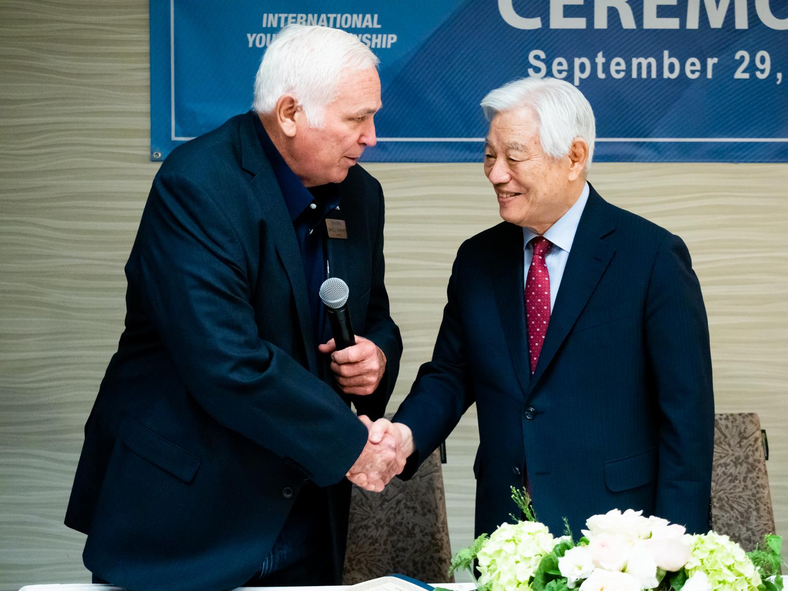 스탠턴(Stanton) 시 시장 David Shawver과 설립자 박옥수 목사가 사인식에 앞서 인사를 나누고 있다.